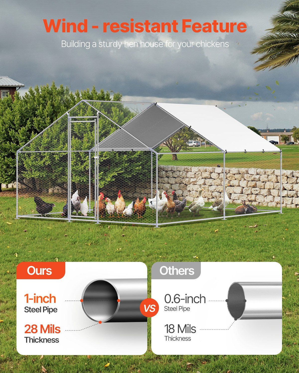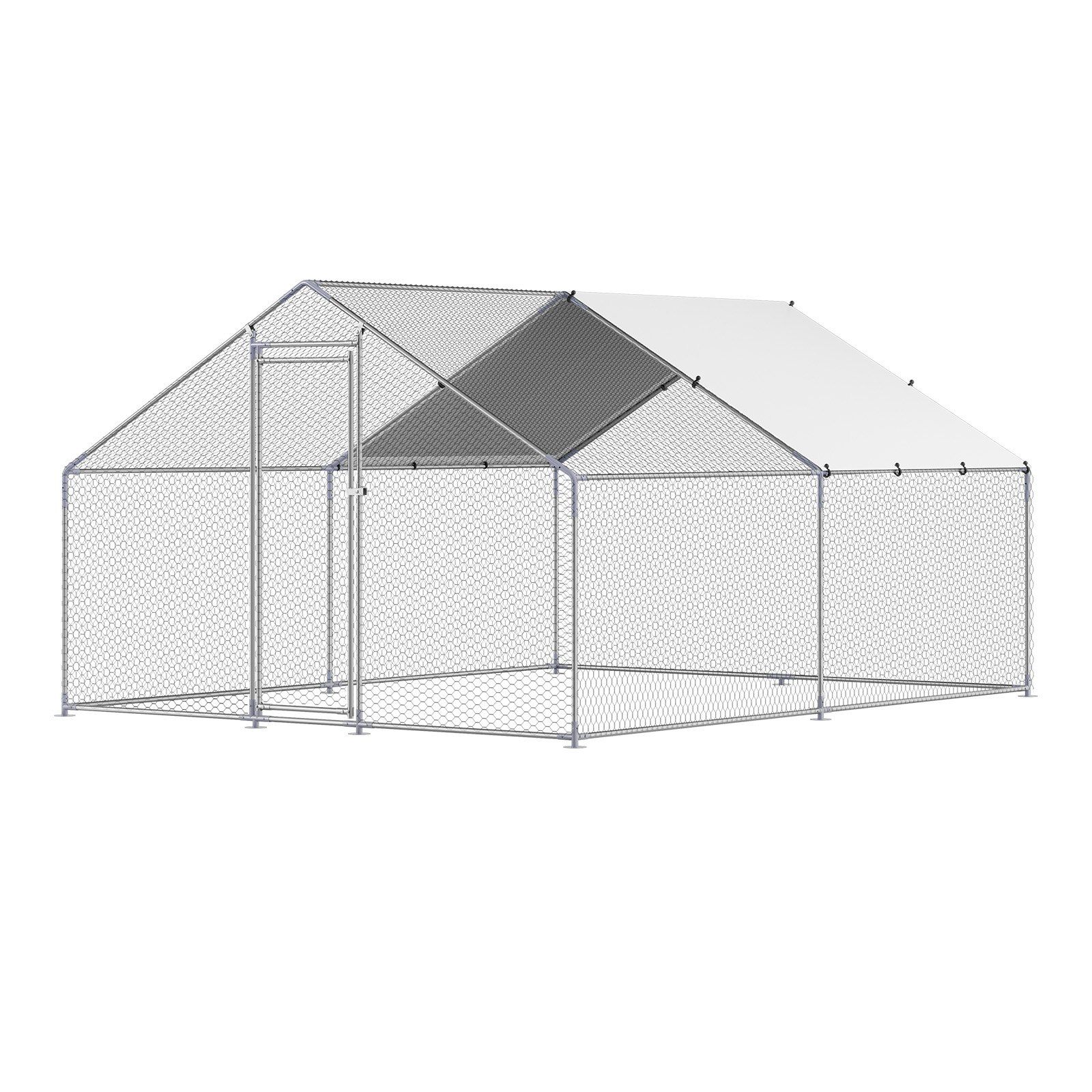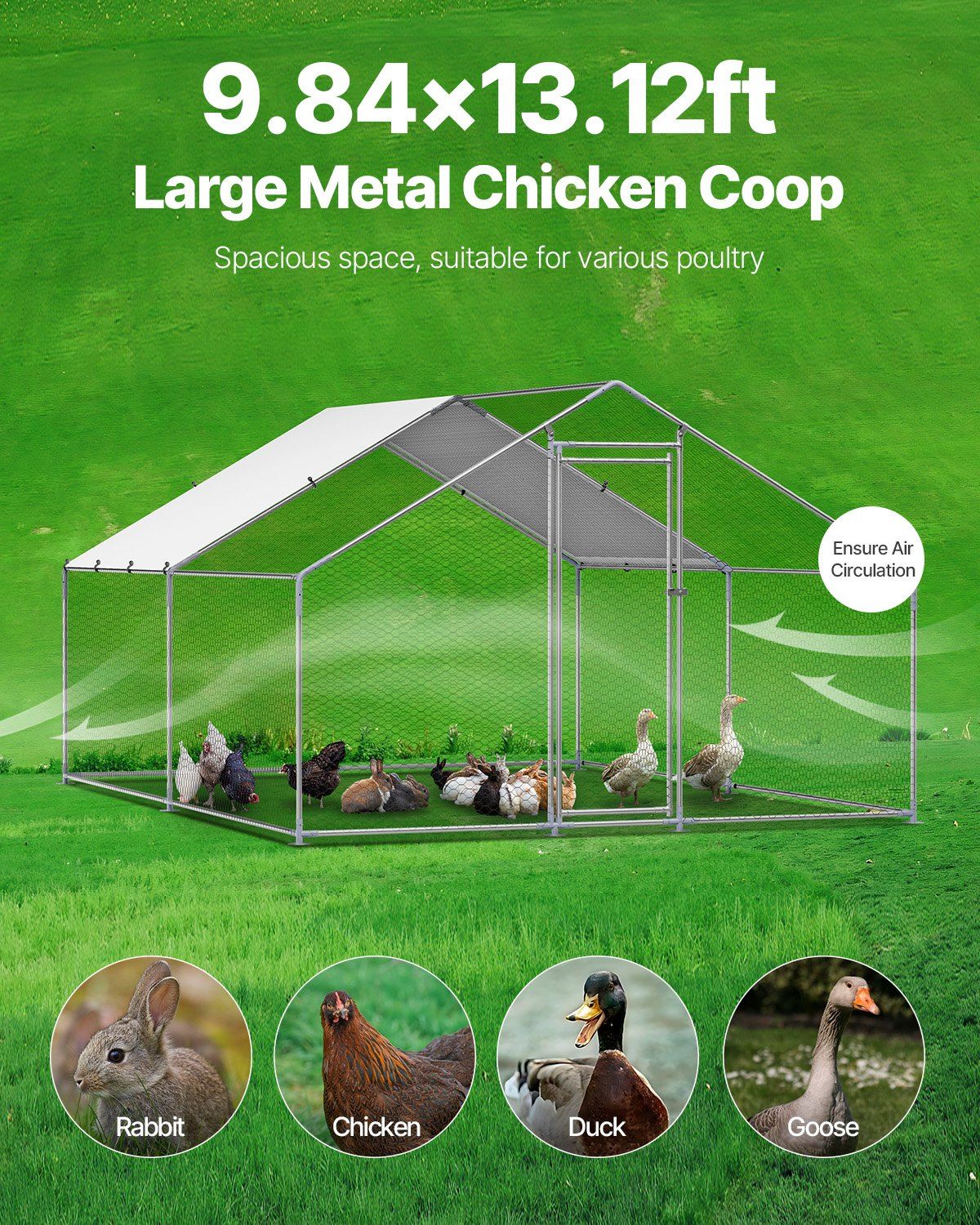3.Spacious Living Area: Offering a generous 9.8x13.1x6.5 ft of space, this metal chicken run features four-sided ventilation, creating a healthy and comfortable environment. The PE-coated canopy provides sun protection, waterproofing, and tear resistance, shielding your poultry from external elements.