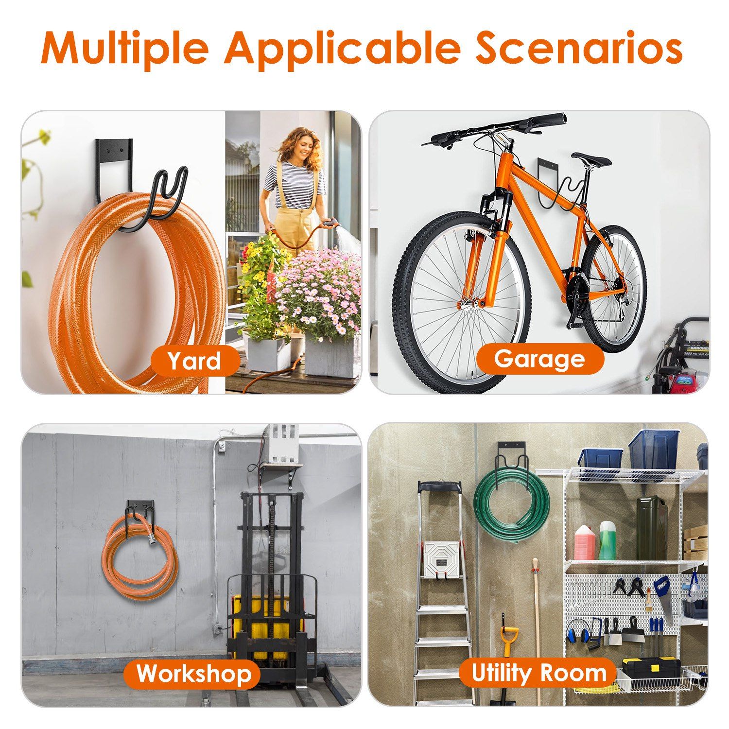 *Wide Applications*:Our hose rack fits any size of hose,such as 25ft,50ft,75ft,100ft and so on. Widely used for water hoses,extension cords,vacuum hoses,pool hose hangers,strollers,bikes,etc.. Hold up to 150ft of 1/2" diameter hose, 110ft of 5/8" diameter hose,100ft of 3/4' diameter hose and more.