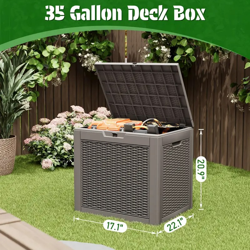 The 35 Gallon Waterproof Outdoor Deck Box is the ultimate solution for organizing and protecting your outdoor essentials. Crafted from premium weather-resistant resin, it provides exceptional durability against rain, UV rays, and temperature changes, ensuring long-term use without fading, peeling, or rusting. Its generous 35-gallon capacity is perfect for storing outdoor cushions, garden tools, toys, pool accessories, and more—keeping them safe, dry, and dust-free. The box features a lockable lid design for added security, and integrated side handles for effortless portability. Whether placed on your patio, in the garden, or by the pool, this storage box combines practicality and style, offering a clean and organized outdoor space all year round.![]()