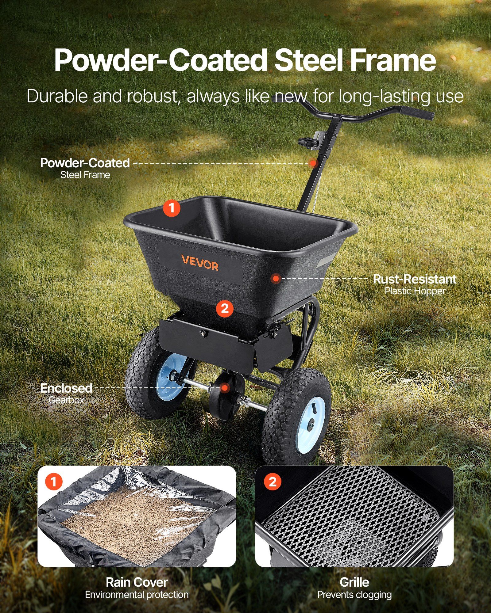 5.Durable & Reliable: The fertilizer spreader features carbon steel frame with powder coating that provides strength and durability, while the rust-resistant hopper and sealed gearbox ensure long-lasting performance and corrosion-free gears for hassle-free seeding and fertilizing.