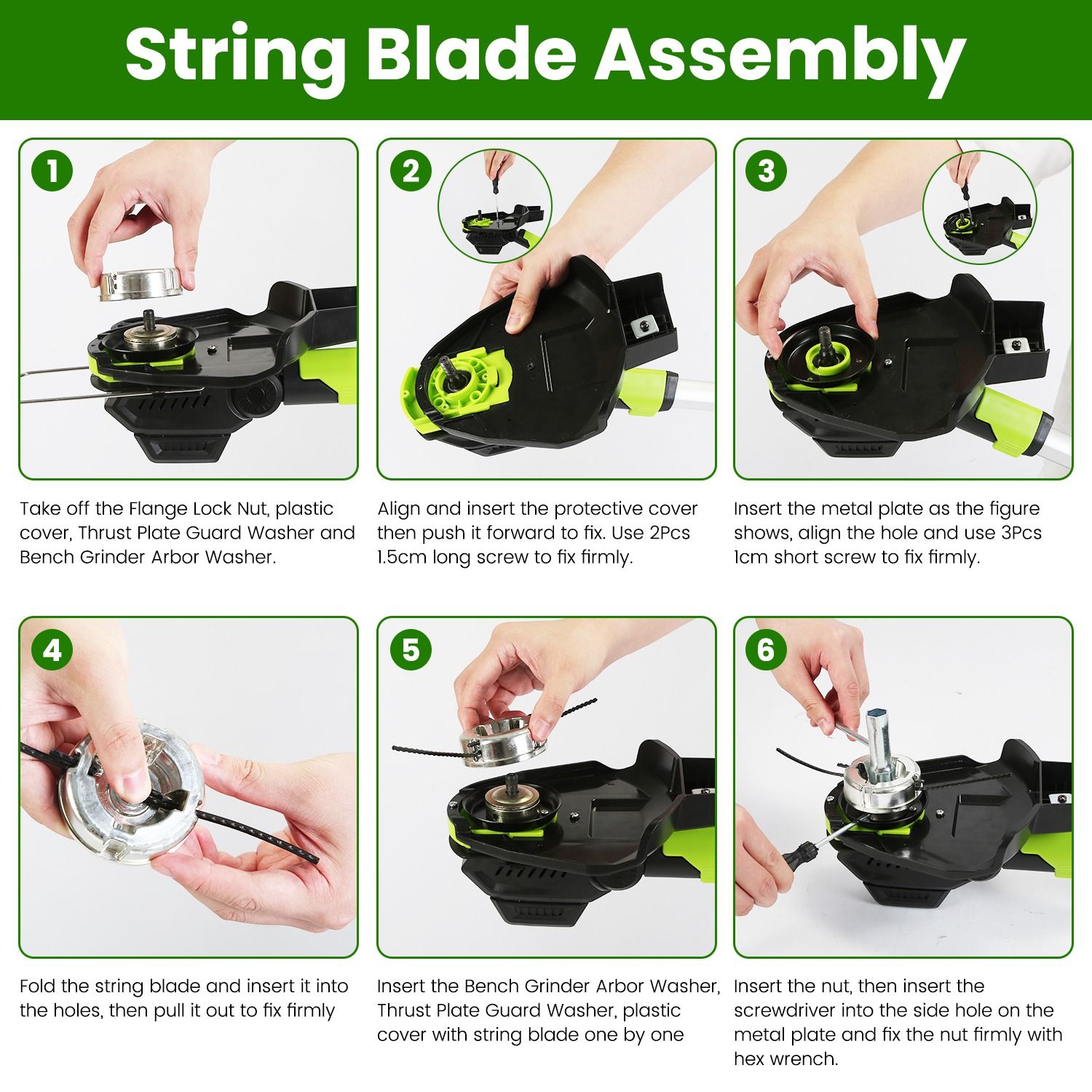 *3 Types Of Blades*:Our lawn mower provides 2Pcs saw blades for branches,crop and bush cutting,6Pcs stainless steel blades for bush and thick grass pruning,and 30Pcs string blades for lawn mowing and tender weed. Suitable for various lawn trimming of family farms,garden,yard,etc.. Please choose the appropriate blade according to various situation,so as to prolong the lifespan of blades.