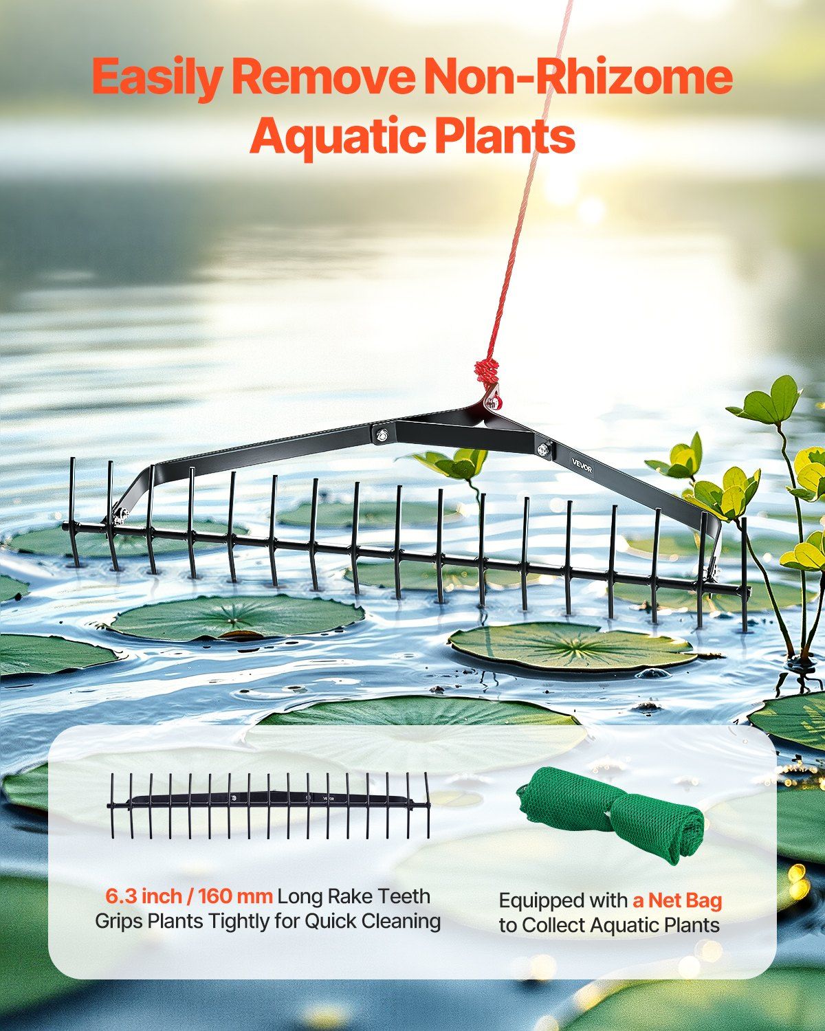 1.Efficiently Removing Aquatic Weed: The large 32 x 6.3-in rake head, is designed for clearing aquatic plants in lakes, ponds, and rivers. The 6.3-in hook-shaped tines firmly grip and remove the weeds, keeping water clear, improving water quality, and enhancing water-based activities.