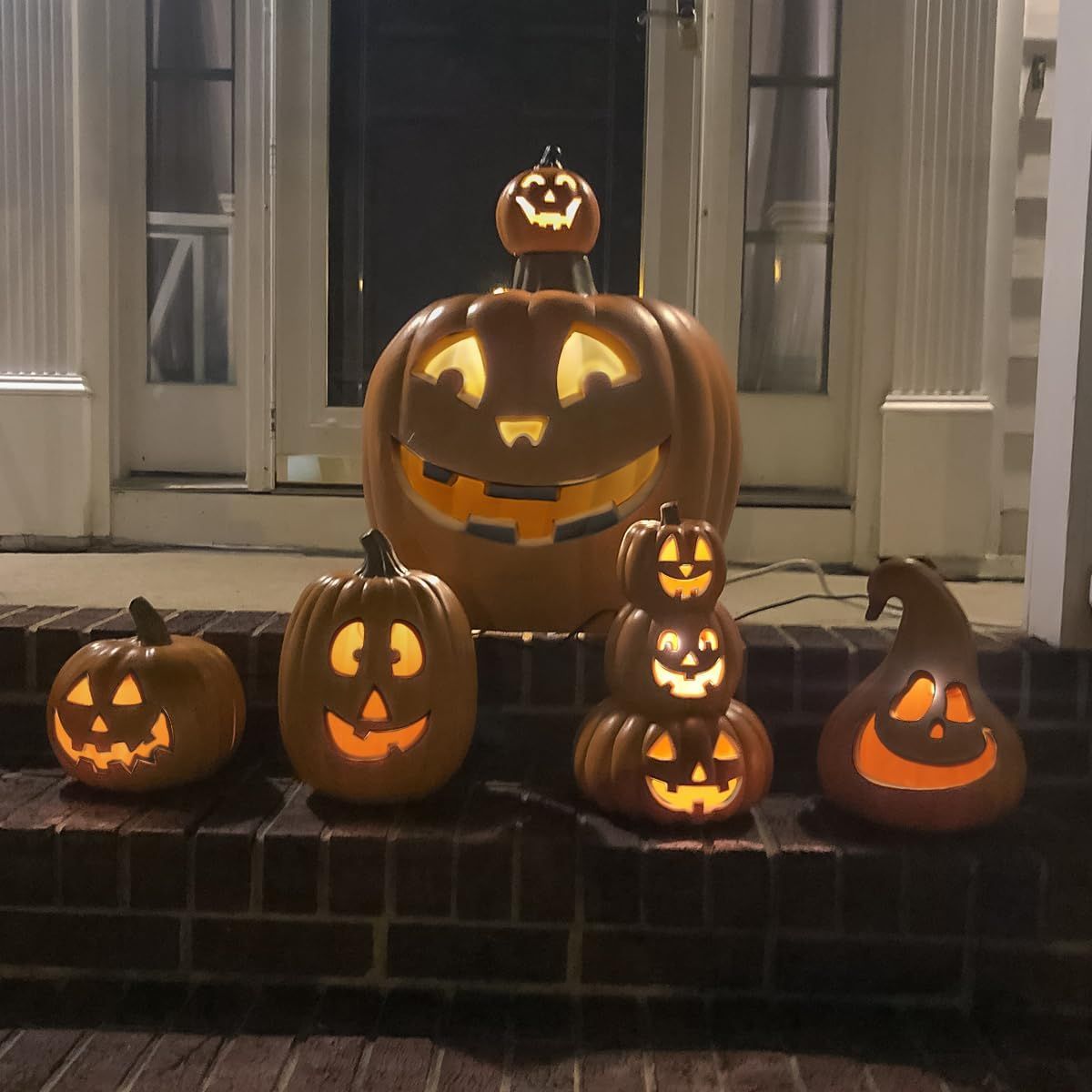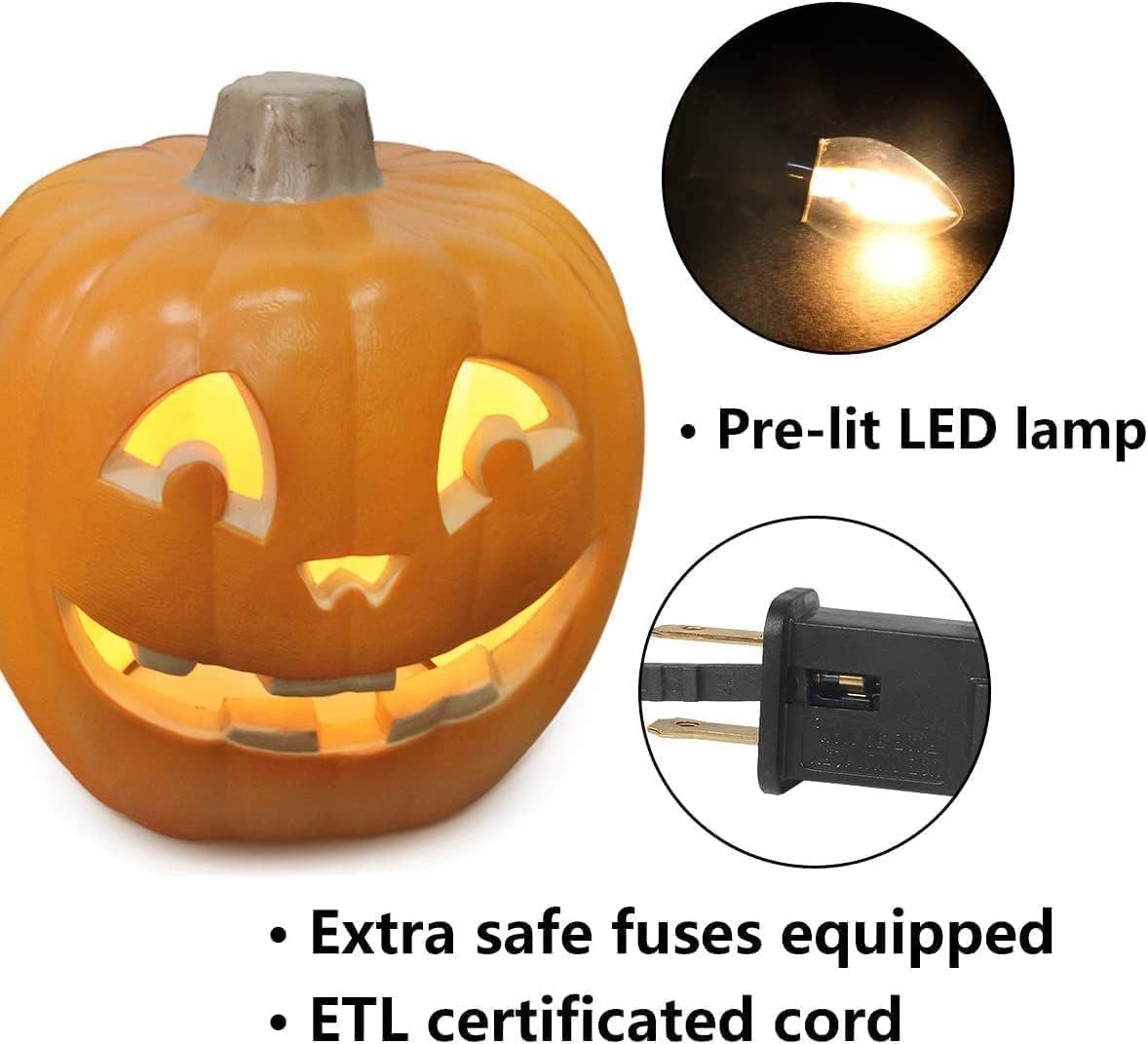 ULTRA-SAFE PRELIT PUMPKIN- This Halloween jack-o-lantern uses premium PP material and LED lights instead of real pumpkins and candles, flameless, non-toxic, and odor-free. Each pumpkin is equipped with UL and ETL-listed cords, LED bulbs, and 2 ultra-safe fuses, light up pumpkins are the perfect addition to indoor and outdoor decor.OUTDOOR & INDOOR DECORATIONS - The Halloween lanterns with PP shells and ETL-listed cord and bulbs that are waterproof, allow for both indoor & outdoor use. The bottom hole helps drain water out when it rains. Easy to clean and carry.DURABLE QUALITY & SHATTERPROOF - These fake artificial lighted pumpkins are made of high-quality PP material that features safe, environmentally, and shatterproof. It's reusable year after year. Besides, this Halloween pumpkin is lightweight and easy to move, allowing you to easily change the placement of the jack-o-lantern to decorate different areas of your home or yard.VARIOUS PUMPKIN SIZES & PATTERN- There are various sizes of pumpkins for your options, like 6/10/11/12/13/14/ 15/16/20/21 inches, with different faces. The spooky, or scary face for adding more atmosphere to Halloween. The smiling face is for Happy Halloween decorations if you don't want to scare the kids. Different sizes meet your different needs for Halloween decorations ideas, a mantle or front porch are both great. It will be a big hit at your Halloween party!REALISTIC PUMPKIN - Our pumpkin lantern is designed with a unique style, coated with long-lasting orange color, making the jack-o-lantern like a real pumpkin. It stands through sunshine and rain, as vivid as always, and will not fade.