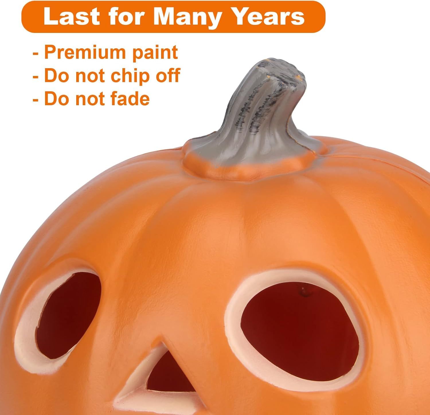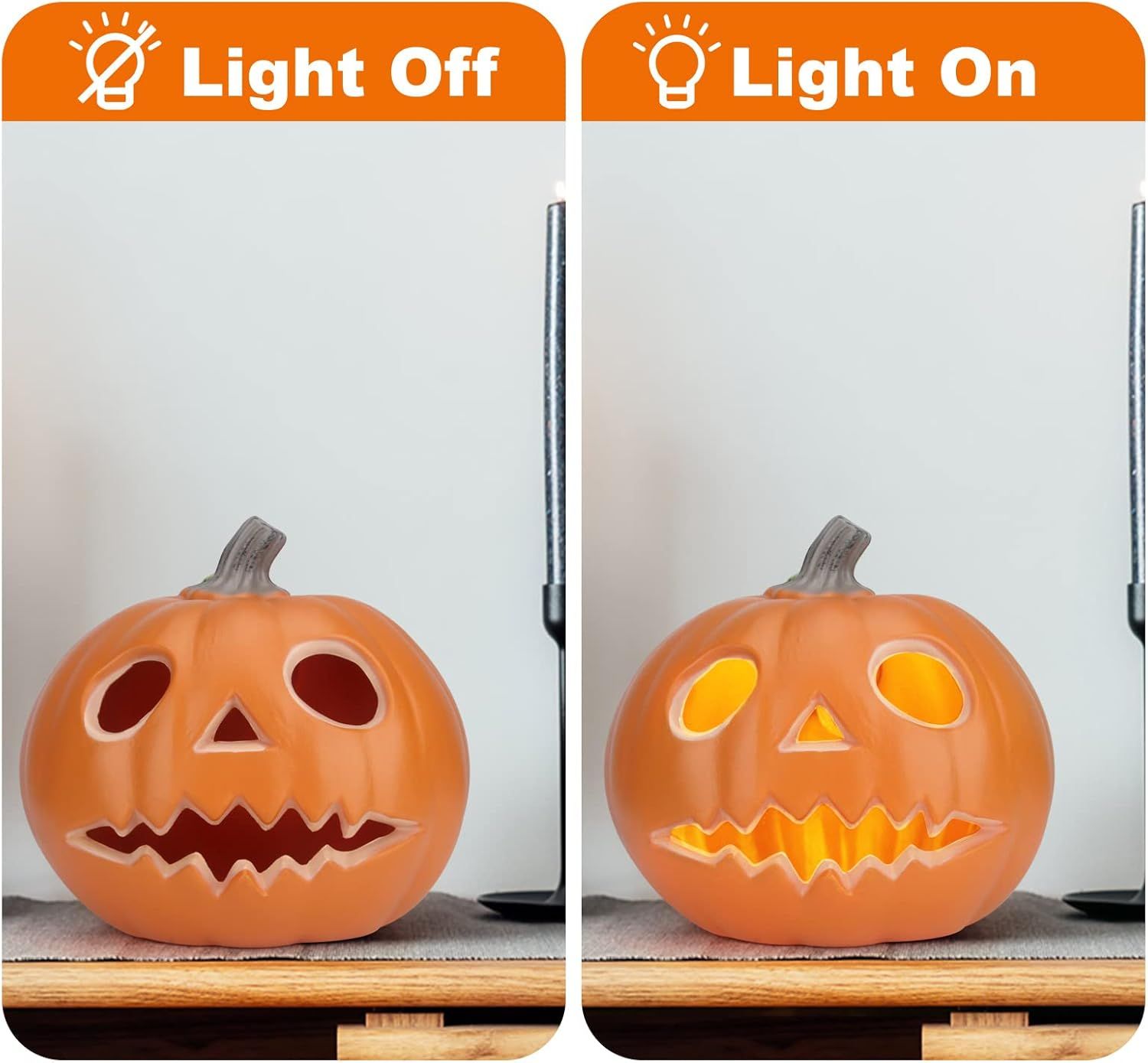 ULTRA-SAFE PRELIT PUMPKIN- This Halloween jack-o-lantern uses premium PP material and LED lights instead of real pumpkins and candles, flameless, non-toxic, and odor-free. Each pumpkin is equipped with UL and ETL-listed cords, LED bulbs, and 2 ultra-safe fuses, light up pumpkins are the perfect addition to indoor and outdoor decor.OUTDOOR & INDOOR DECORATIONS - The Halloween lanterns with PP shells and ETL-listed cord and bulbs that are waterproof, allow for both indoor & outdoor use. The bottom hole helps drain water out when it rains. Easy to clean and carry.DURABLE QUALITY & SHATTERPROOF - These fake artificial lighted pumpkins are made of high-quality PP material that features safe, environmentally, and shatterproof. It's reusable year after year. Besides, this Halloween pumpkin is lightweight and easy to move, allowing you to easily change the placement of the jack-o-lantern to decorate different areas of your home or yard.VARIOUS PUMPKIN SIZES & PATTERN- There are various sizes of pumpkins for your options, like 6/10/11/12/13/14/ 15/16/20/21 inches, with different faces. The spooky, or scary face for adding more atmosphere to Halloween. The smiling face is for Happy Halloween decorations if you don't want to scare the kids. Different sizes meet your different needs for Halloween decorations ideas, a mantle or front porch are both great. It will be a big hit at your Halloween party!REALISTIC PUMPKIN - Our pumpkin lantern is designed with a unique style, coated with long-lasting orange color, making the jack-o-lantern like a real pumpkin. It stands through sunshine and rain, as vivid as always, and will not fade.