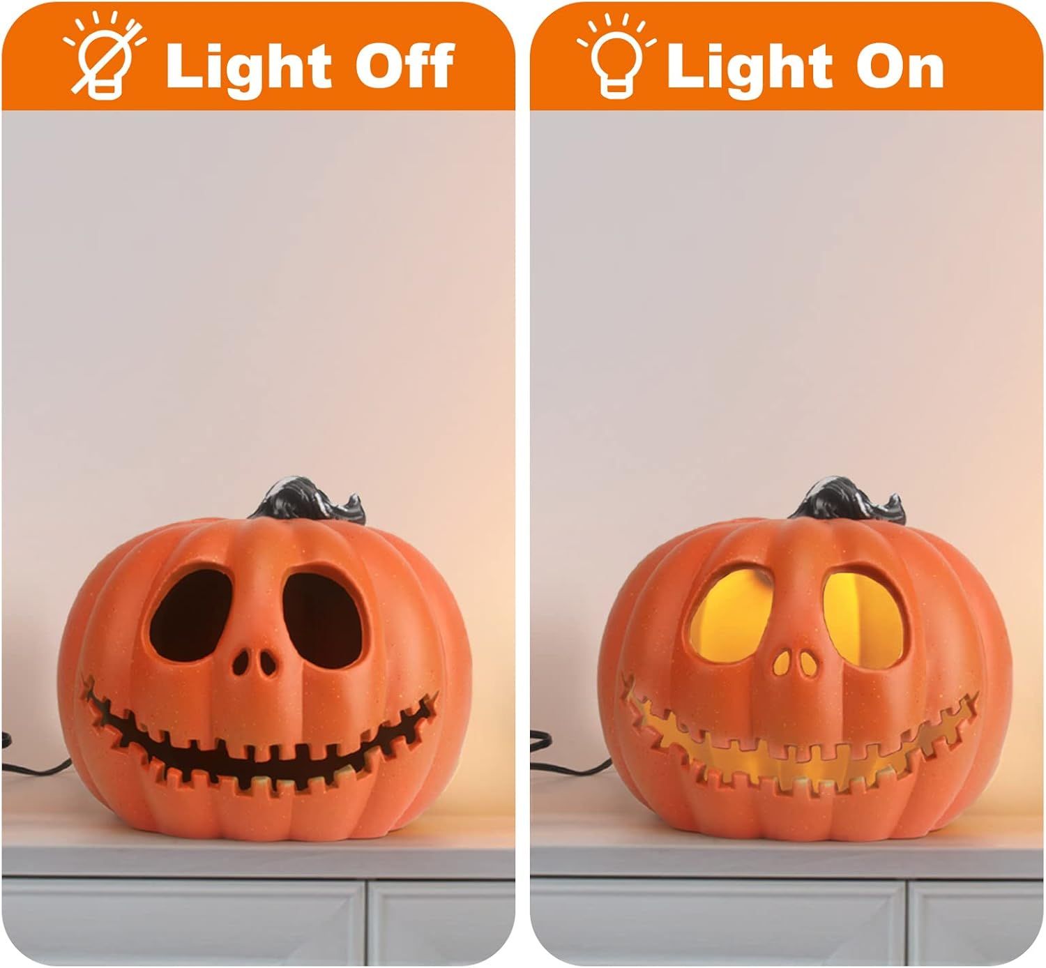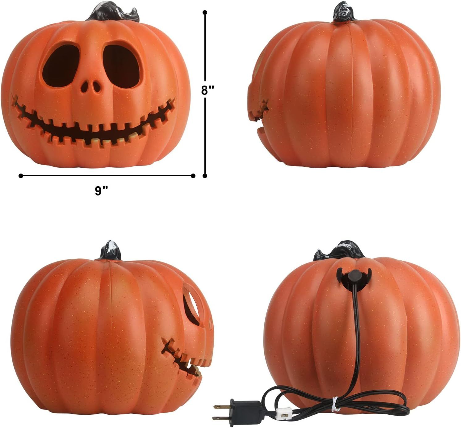 ULTRA-SAFE PRELIT PUMPKIN- This Halloween jack-o-lantern uses premium PP material and LED lights instead of real pumpkins and candles, flameless, non-toxic, and odor-free. Each pumpkin is equipped with UL and ETL-listed cords, LED bulbs, and 2 ultra-safe fuses, light up pumpkins are the perfect addition to indoor and outdoor decor.OUTDOOR & INDOOR DECORATIONS - The Halloween lanterns with PP shells and ETL-listed cord and bulbs that are waterproof, allow for both indoor & outdoor use. The bottom hole helps drain water out when it rains. Easy to clean and carry.DURABLE QUALITY & SHATTERPROOF - These fake artificial lighted pumpkins are made of high-quality PP material that features safe, environmentally, and shatterproof. It's reusable year after year. Besides, this Halloween pumpkin is lightweight and easy to move, allowing you to easily change the placement of the jack-o-lantern to decorate different areas of your home or yard.VARIOUS PUMPKIN SIZES & PATTERN- There are various sizes of pumpkins for your options, like 6/10/11/12/13/14/ 15/16/20/21 inches, with different faces. The spooky, or scary face for adding more atmosphere to Halloween. The smiling face is for Happy Halloween decorations if you don't want to scare the kids. Different sizes meet your different needs for Halloween decorations ideas, a mantle or front porch are both great. It will be a big hit at your Halloween party!REALISTIC PUMPKIN - Our pumpkin lantern is designed with a unique style, coated with long-lasting orange color, making the jack-o-lantern like a real pumpkin. It stands through sunshine and rain, as vivid as always, and will not fade.