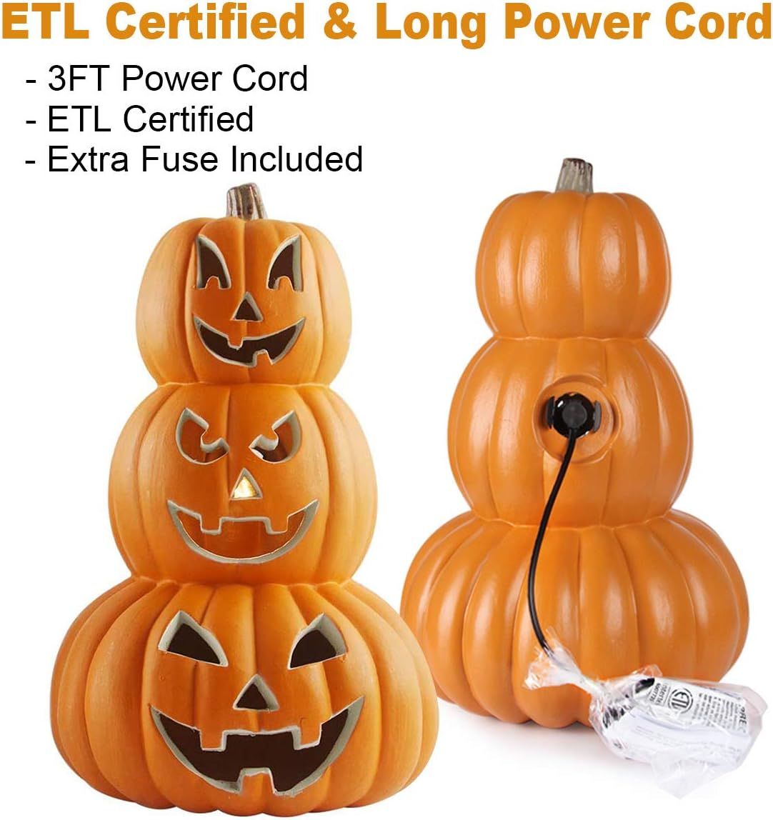 ULTRA-SAFE PRELIT PUMPKIN- This Halloween jack-o-lantern uses premium PP material and LED lights instead of real pumpkins and candles, flameless, non-toxic, and odor-free. Each pumpkin is equipped with UL and ETL-listed cords, LED bulbs, and 2 ultra-safe fuses, light up pumpkins are the perfect addition to indoor and outdoor decor.OUTDOOR & INDOOR DECORATIONS - The Halloween lanterns with PP shells and ETL-listed cord and bulbs that are waterproof, allow for both indoor & outdoor use. The bottom hole helps drain water out when it rains. Easy to clean and carry.DURABLE QUALITY & SHATTERPROOF - These fake artificial lighted pumpkins are made of high-quality PP material that features safe, environmentally, and shatterproof. It's reusable year after year. Besides, this Halloween pumpkin is lightweight and easy to move, allowing you to easily change the placement of the jack-o-lantern to decorate different areas of your home or yard.VARIOUS PUMPKIN SIZES & PATTERN- There are various sizes of pumpkins for your options, like 6/10/11/12/13/14/ 15/16/20/21 inches, with different faces. The spooky, or scary face for adding more atmosphere to Halloween. The smiling face is for Happy Halloween decorations if you don't want to scare the kids. Different sizes meet your different needs for Halloween decorations ideas, a mantle or front porch are both great. It will be a big hit at your Halloween party!REALISTIC PUMPKIN - Our pumpkin lantern is designed with a unique style, coated with long-lasting orange color, making the jack-o-lantern like a real pumpkin. It stands through sunshine and rain, as vivid as always, and will not fade.