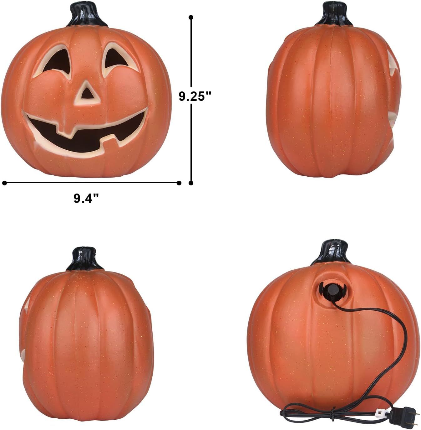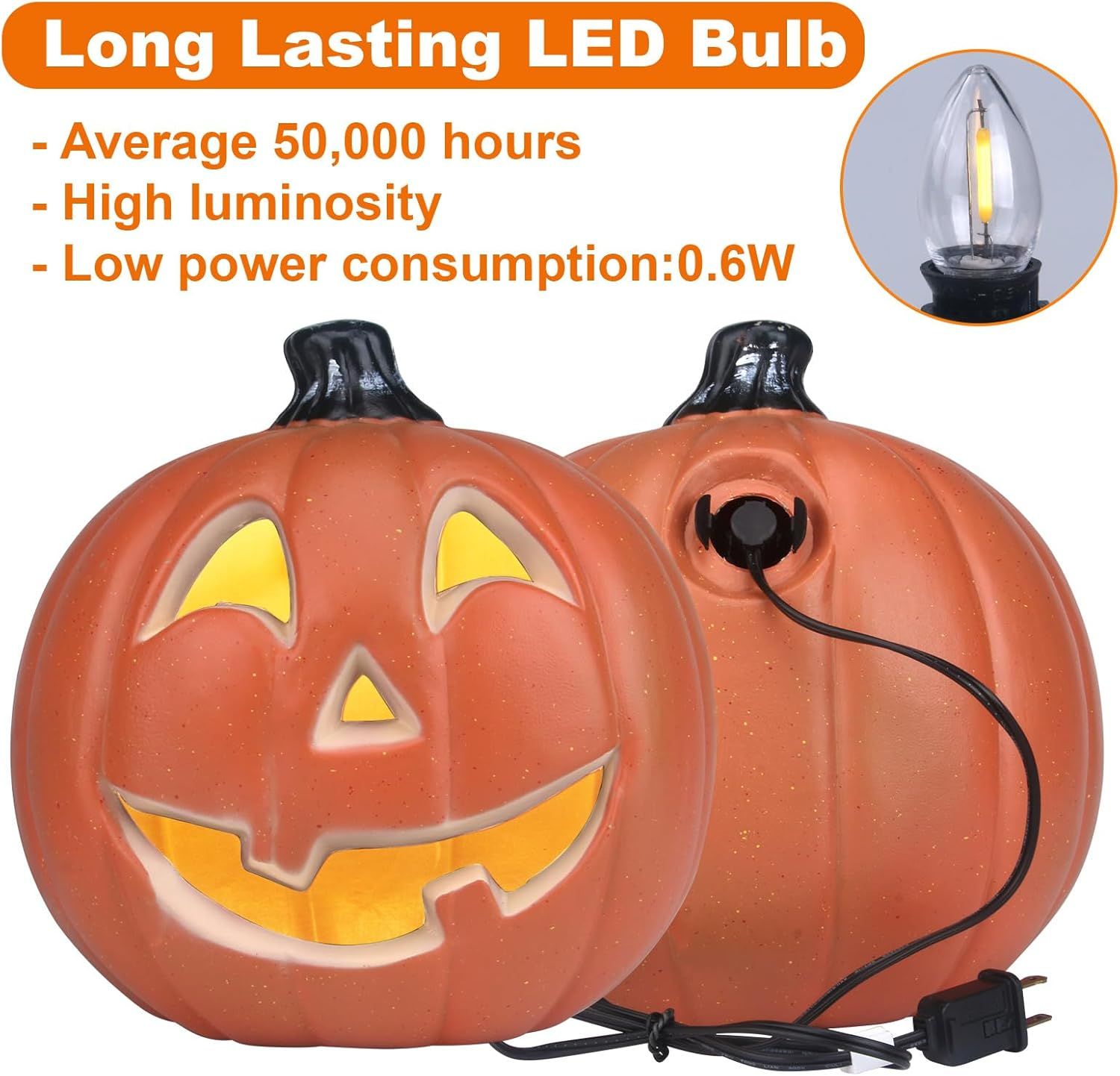 ULTRA-SAFE PRELIT PUMPKIN- This Halloween jack-o-lantern uses premium PP material and LED lights instead of real pumpkins and candles, flameless, non-toxic, and odor-free. Each pumpkin is equipped with UL and ETL-listed cords, LED bulbs, and 2 ultra-safe fuses, light up pumpkins are the perfect addition to indoor and outdoor decor.OUTDOOR & INDOOR DECORATIONS - The Halloween lanterns with PP shells and ETL-listed cord and bulbs that are waterproof, allow for both indoor & outdoor use. The bottom hole helps drain water out when it rains. Easy to clean and carry.DURABLE QUALITY & SHATTERPROOF - These fake artificial lighted pumpkins are made of high-quality PP material that features safe, environmentally, and shatterproof. It's reusable year after year. Besides, this Halloween pumpkin is lightweight and easy to move, allowing you to easily change the placement of the jack-o-lantern to decorate different areas of your home or yard.VARIOUS PUMPKIN SIZES & PATTERN- There are various sizes of pumpkins for your options, like 6/10/11/12/13/14/ 15/16/20/21 inches, with different faces. The spooky, or scary face for adding more atmosphere to Halloween. The smiling face is for Happy Halloween decorations if you don't want to scare the kids. Different sizes meet your different needs for Halloween decorations ideas, a mantle or front porch are both great. It will be a big hit at your Halloween party!REALISTIC PUMPKIN - Our pumpkin lantern is designed with a unique style, coated with long-lasting orange color, making the jack-o-lantern like a real pumpkin. It stands through sunshine and rain, as vivid as always, and will not fade.