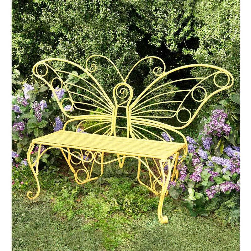 With its large, butterfly-shaped backrest, this Modern Metamorphosis Metal Butterfly Garden Bench Yellow adds an elegant look to your landscape. It's also at home in a sunroom or entry, with a butterfly-shaped backrest that's sure to be a focal point of any space. Crafted of metal and finished with a weather-resistant, antique color powder coating for outdoor durability.